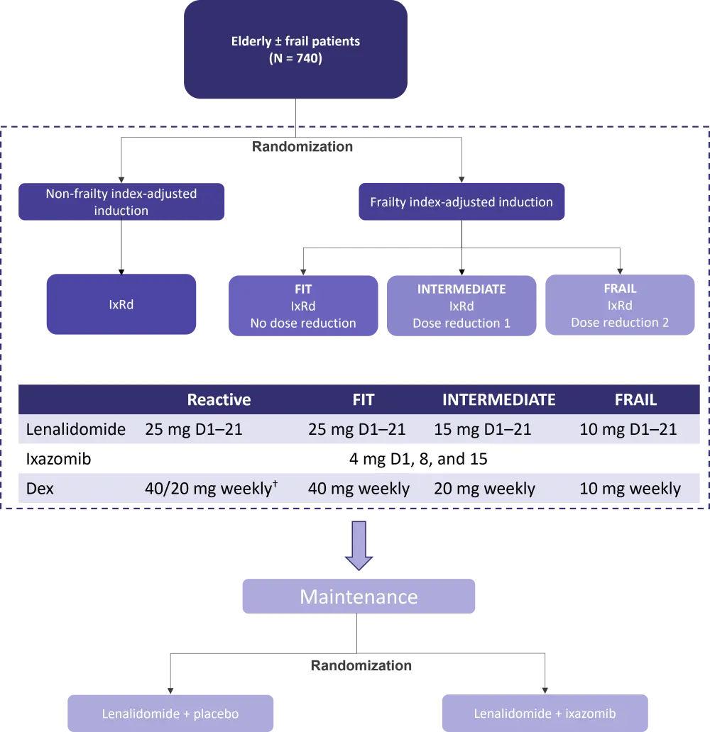 The Myeloma XIV: FiTNEsS (frailty-adjusted therapy in transplant non-eligible patients with symptomatic myeloma) study (NCT03720041) represents a significant step in determining the predictive value of a novel frailty risk score: the UK Myeloma Research Alliance Myeloma Risk Profile4. Initiated in the United Kingdom, FiTNEsS was designed to evaluate the feasibility and efficacy of upfront frailty index-adjusted induction therapy (Figure 1). Under evaluation is the oral triplet regimen, ixazomib-lenalidomide-dexamethasone: the investigators hope to see a significant toxicities reduction with the adaptive treatment strategy, which would translate into fewer early treatment discontinuations. Thus, more patients would arrive at the maintenance phase, receive a doublet maintenance therapy, and overall, achieve a longer PFS.