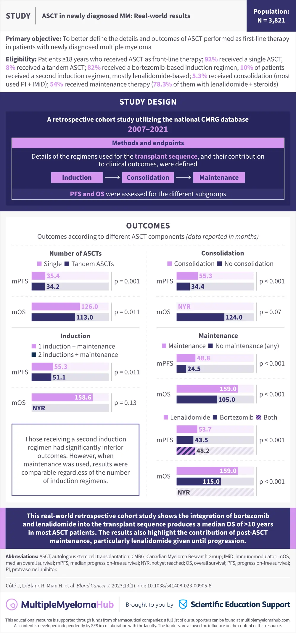 The Multiple Myeloma Hub is pleased to present a visual abstract on a real-world retrospective cohort study by Côté J, et al.1 evaluating the outcomes of ASCT performed as first-line therapy in patients with newly diagnosed MM. The different regimens used for the transplant treatment sequence (induction, consolidation, maintenance) and their contribution to clinical outcomes were evaluated. The study found that: