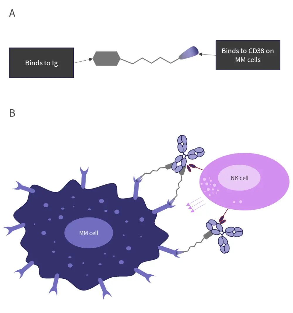 A The structure of BHV-1100. B BHV-1100 binds to Ig and CD38 receptors on MM cells, recruiting NK cells and activating antibody-dependent tumor lysis.