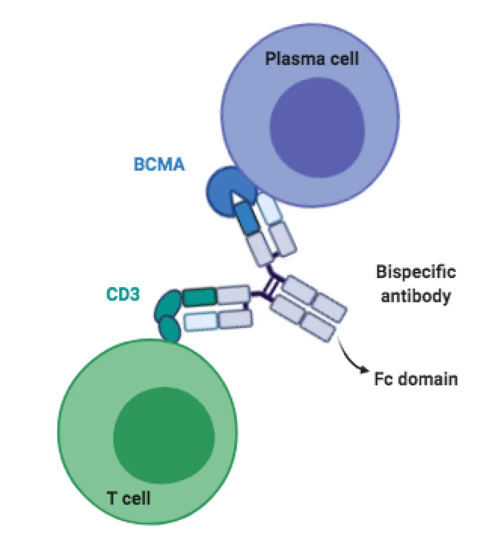 Figure 1. Schematic illustration of the structure of a BCMA-targeting bispecific antibody. Bispecific T-cell engagers (BiTEs) lack the Fc domain and the target-binding fragments are connected by a linker.