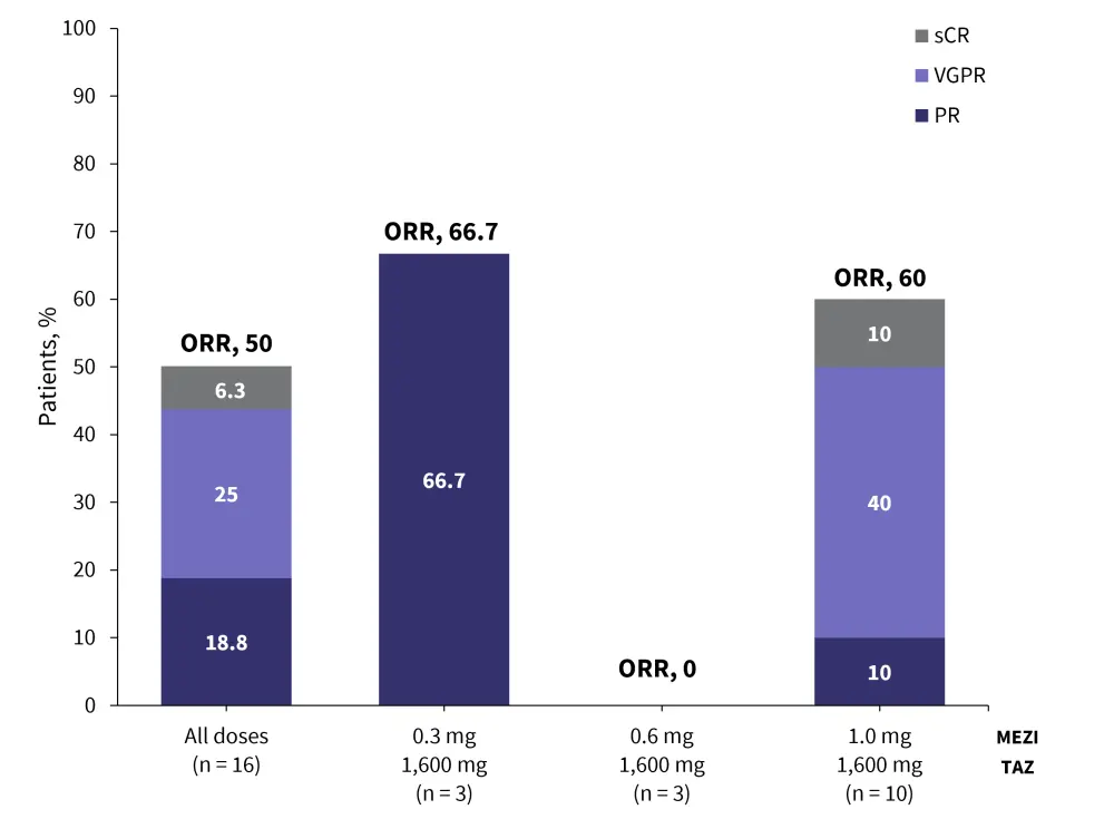 CR, complete response; MEZI, mezigdomide; MEZId, mezigdomide-dexamethasone; ORR, overall response rate; PR, partial response; sCR, stringent complete response; TAZ, tazemetostat; VGPR, very good partial response.