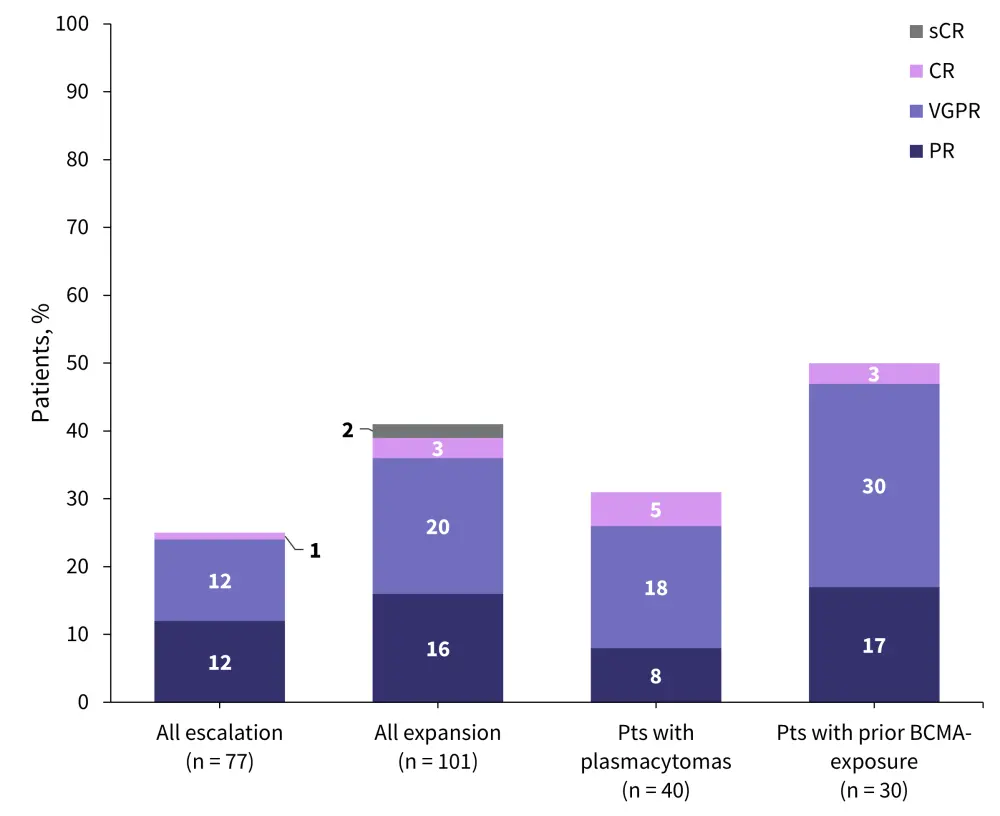 BCMA, B-cell maturation antigen; CR, complete response; ORR, overall response rate; PR, partial response; Pts, patients; sCR, stringent complete response; VGPR, very good partial response.