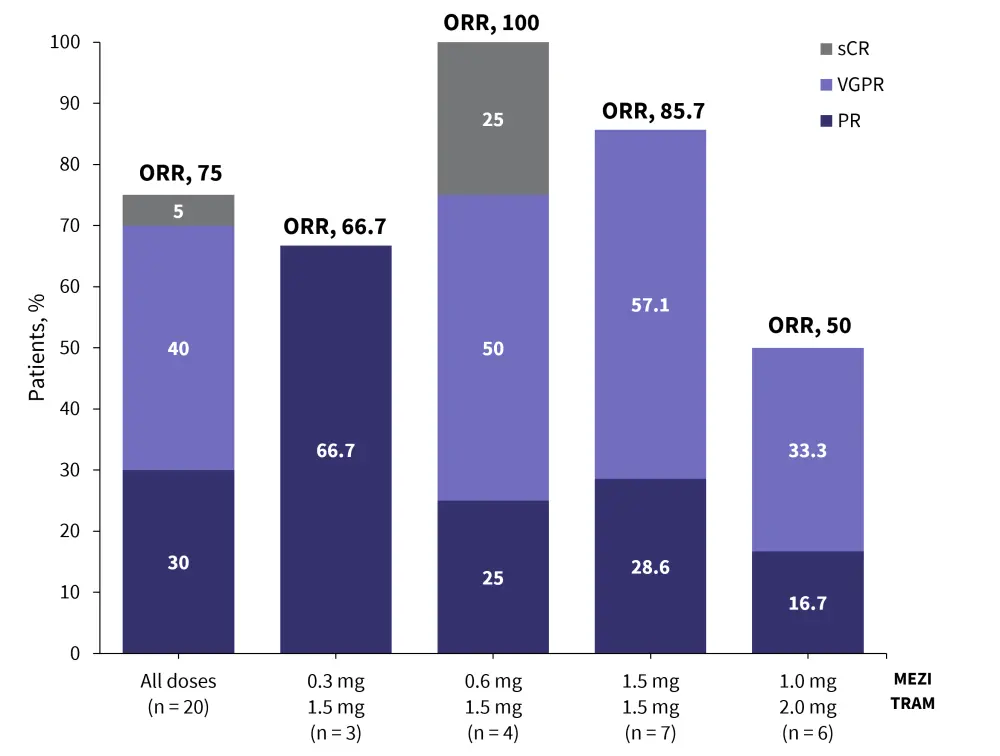 CR, complete response; MEZI, mezigdomide; MEZId, mezigdomide-dexamethasone; ORR, overall response rate; PR, partial response; sCR, stringent complete response; TRAM, trametinib; VGPR, very good partial response.