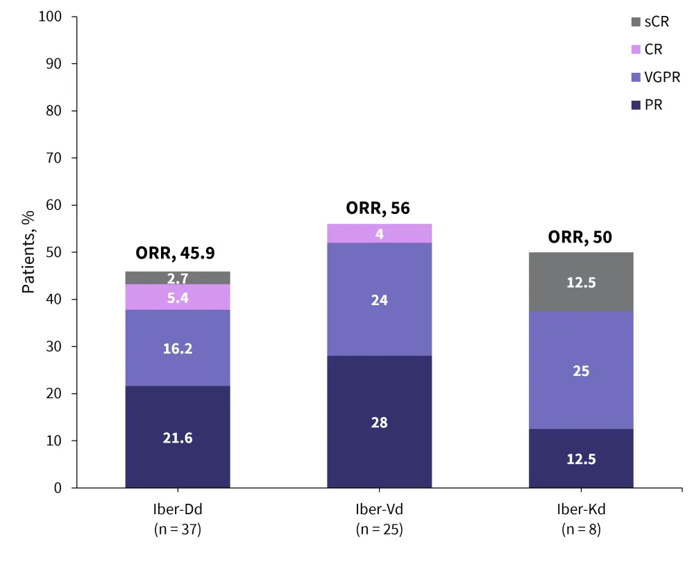 CR, complete response; Iber-Dd, iberdomide-daratumumab-dexamethasone; Iber-Vd, iberdomide-bortezomib-dexamethasone; Iber-Kd, iberdomide-carfilzomib-dexamethasone; ORR, overall response rate; PR, partial response; sCR, stringent complete response; VGPR, very good partial response.