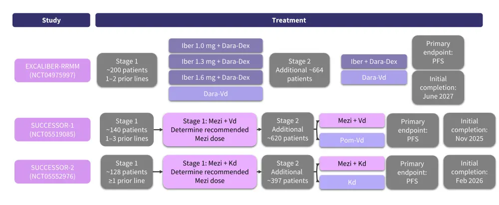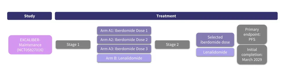 The phase III EXCALIBER-RRMM trial (NCT04975997) will assess the efficacy and safety of IberDd vs daratumumab plus bortezomib and dexamethasone (DVd) in patients aged ≥18 years with RRMM and 1–2 prior lines of therapy with a partial response or better to ≥1 prior line of therapy and progressive disease during or after the last regimen. This trial will be conducted in two stages. In Stage 1, ≥200 patients will be randomized 1:1:1:1 to receive iberdomide at 1.0, 1.3, or 1.6 mg plus daratumumab and dexamethasone or DVd to identify the optimal dose of iberdomide in the IberDd regimen. In Stage 2, approximately 664 additional patients will be randomized 1:1 to IberDd at the selected dose or DVd for the safety and efficacy analysis. Patients will be stratified by prior treatment lines (1 vs 2), age (≤70 vs >70 years), and International Staging System (ISS) stage (I–II vs III).