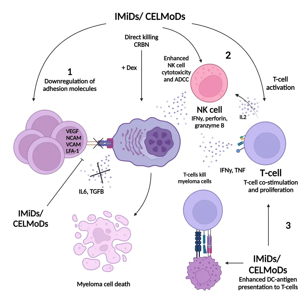 ADCC, antibody-dependent cellular toxicity; BMSC, bone marrow mesenchymal stem cells; CELMoD, cereblon E3 ligase modulatory drug; CRBN, cereblon; DC, dendritic cell; Dex, dexamethasone; IFN, interferon; IL, interleukin; IMiD, immunomodulatory drug; LFA, lymphocyte function-associated antigen; NCAM, neural cell adhesion molecule; NK, natural killer; ROC1, regulator of cullins 1; TCR, T-cell receptor; TGF, transforming growth factor; TNF, tumor necrosis factor; VCAM, vascular cell adhesion molecule; VEGF, vascular endothelial growth factor.