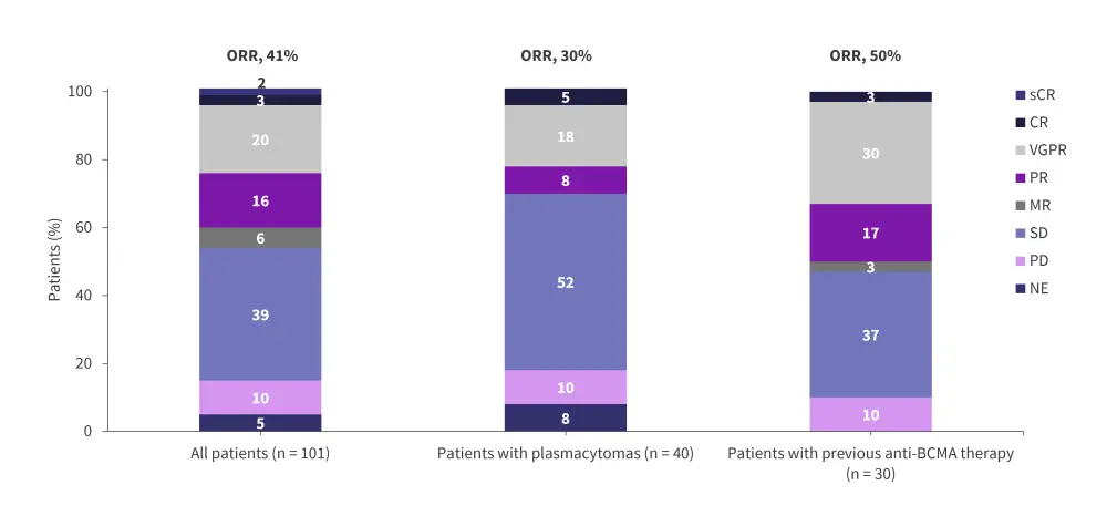 BCMA, B-cell maturation antigen; CR, complete response; MR, minimal response; NE, not evaluable; ORR, overall response rate; PD, progressive disease; PR, partial response; sCR, stringent complete response; SD, stable disease; VGPR, very good partial response.