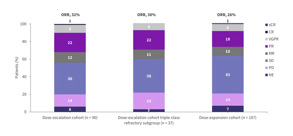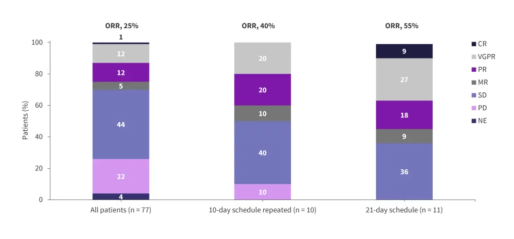 CR, complete response; MR, minimal response; NE, not evaluable; ORR, overall response rate; PD, progressive disease; PR, partial response; sCR, stringent complete response; SD, stable disease; VGPR, very good partial response.