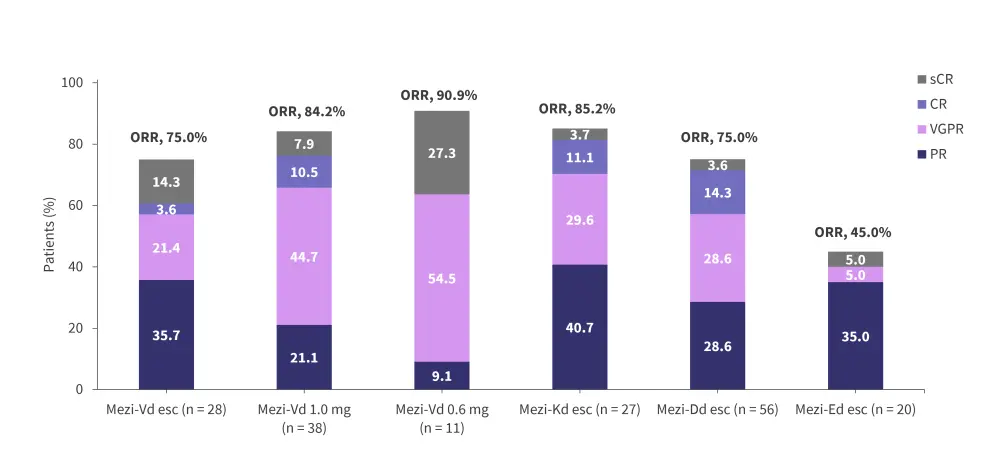 CR, complete response; Dd, daratumumab plus dexamethasone; Ed, elotuzumab plus dexamethasone; esc, dose-escalation cohort; Kd, carfilzomib plus dexamethasone; Mezi, mezigdomide; ORR, overall response rate; PR, partial response; sCR, stringent complete response; Vd, bortezomib plus dexamethasone; VGPR, very good partial response.