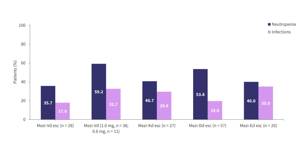 The ongoing phase I/II CC-92480-MM-002 trial (NCT03989414) is assessing the safety and efficacy of mezigdomide in combination with dexamethasone plus bortezomib (MeziVd), carfilzomib (MeziKd), daratumumab (MeziDd), or elotuzumab (MeziEd) in patients with RRMM.1 Patients in this trial are generally less heavily pretreated than in the CC-92480-MM-001 trial, with a median 1–3 prior lines of therapy.1 Preliminary efficacy data indicate ORRs between 45.0–90.9% across the cohorts (Figure 8).1 The median DoRs were 10.9 months and not reached in the dose-escalation and dose-expansion MeziVd cohorts, respectively, and 12.3 months in the dose-escalation MeziKd cohort. Additionally, among patients who were refractory to prior pomalidomide therapy, the ORR was 76.9% and 83.3% in the MeziVd and MeziKd cohorts, respectively.1 In patients who were refractory to prior lenalidomide and anti-CD38 antibody therapy, the ORR was 69.2%, 75.0%, and 82.4% in the MeziVd dose-escalation, MeziVd dose-expansion, and the MeziKd cohorts, respectively.1 The preliminary safety profiles were consistent with mezigdomide plus dexamethasone, with neutropenia and infections being the most common Grade 3–4 AEs (Figure 9).1