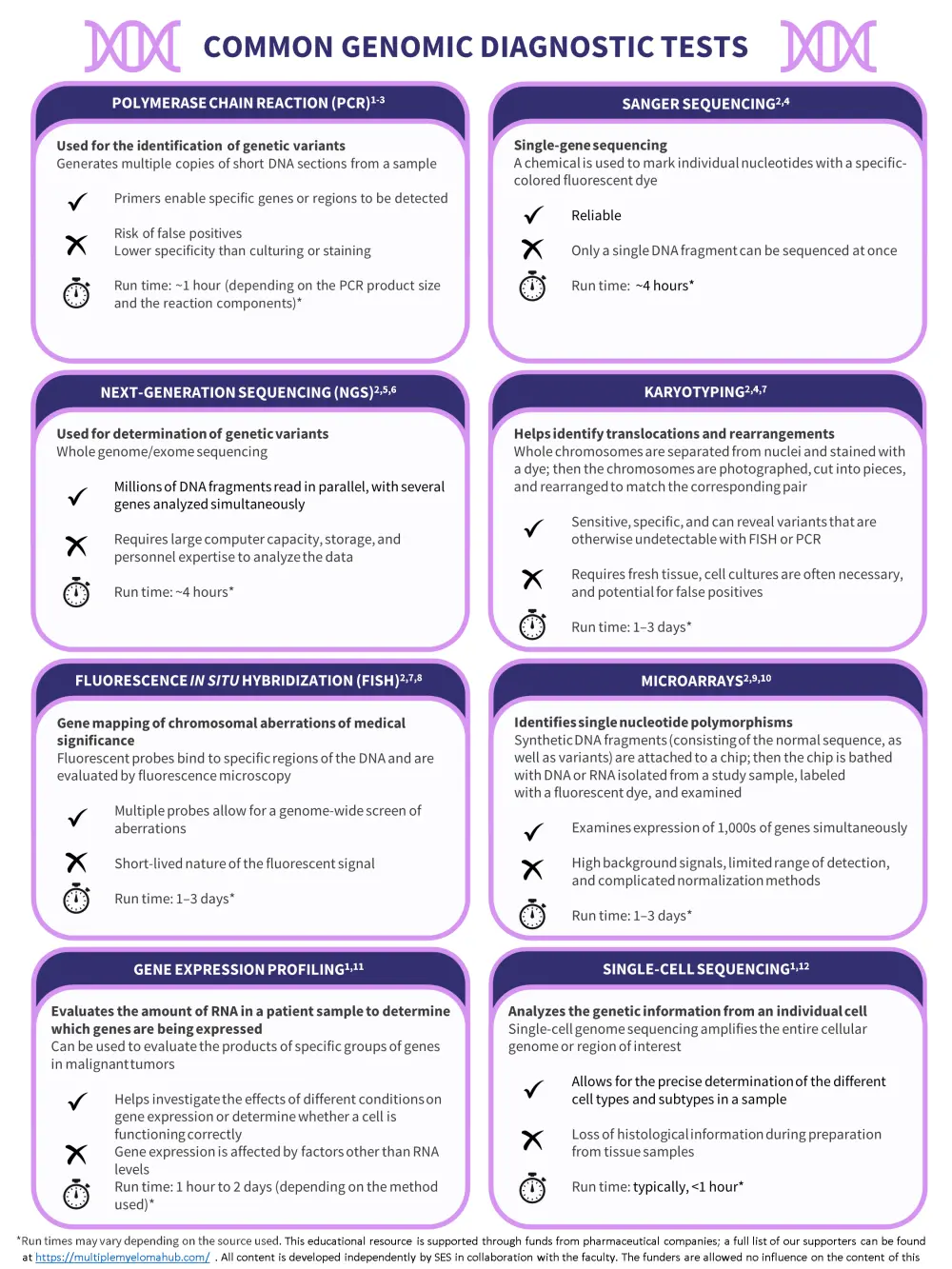 In view of this, the Multiple Myeloma Hub is proud to present a visual summary of the genomic diagnostic techniques commonly used in clinical practice. We outline the use of each technique, as well as their associated advantages and disadvantages.