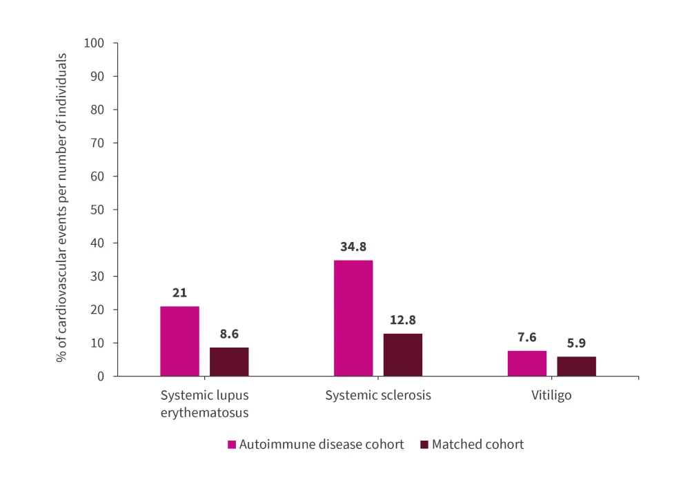 Figure 4. Percentage of cardiovascular events per number of individuals with systemic lupus erythematosus, systemic sclerosis, or vitiligo*