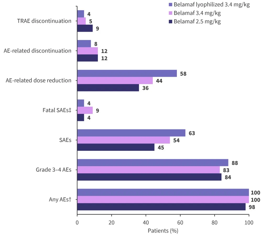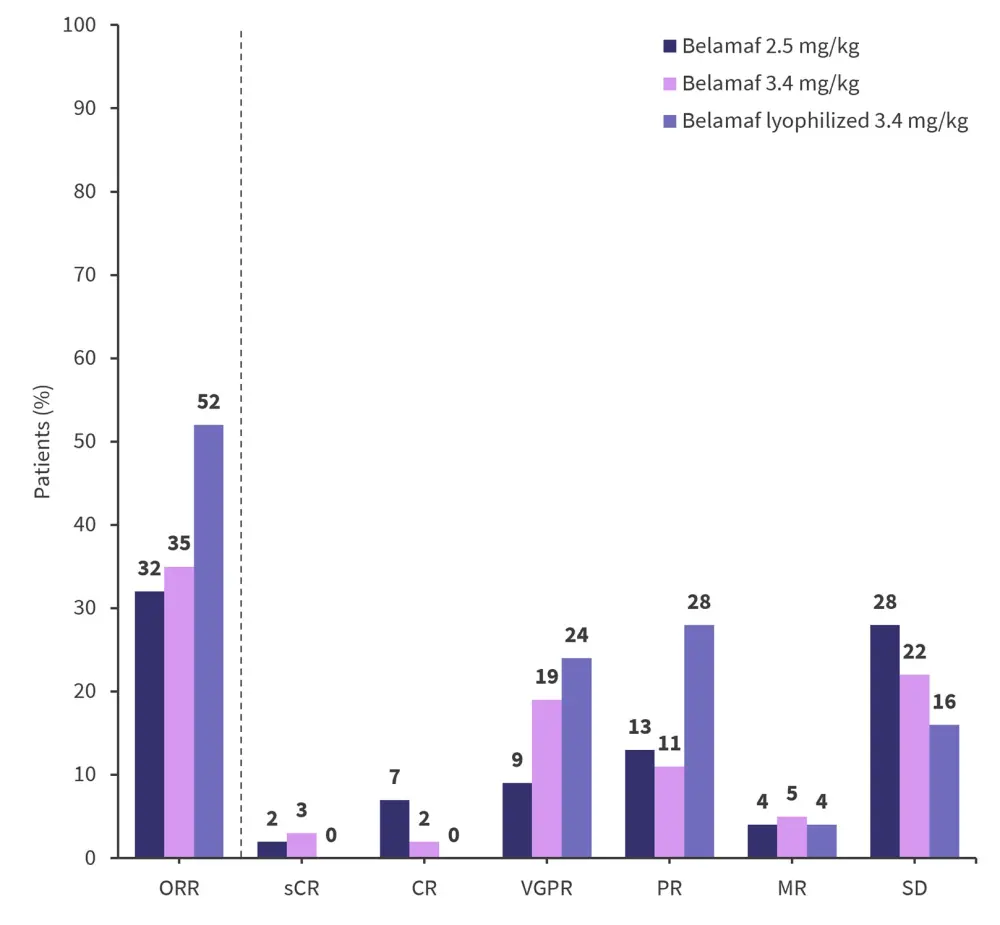 The intention-to-treat population comprised 97, 99, and 25 patients in the belamaf 2.5 mg/kg, 3.4 mg/kg, and belamaf lyophilized cohort, respectively. The data cut-off was March 31, 2022.