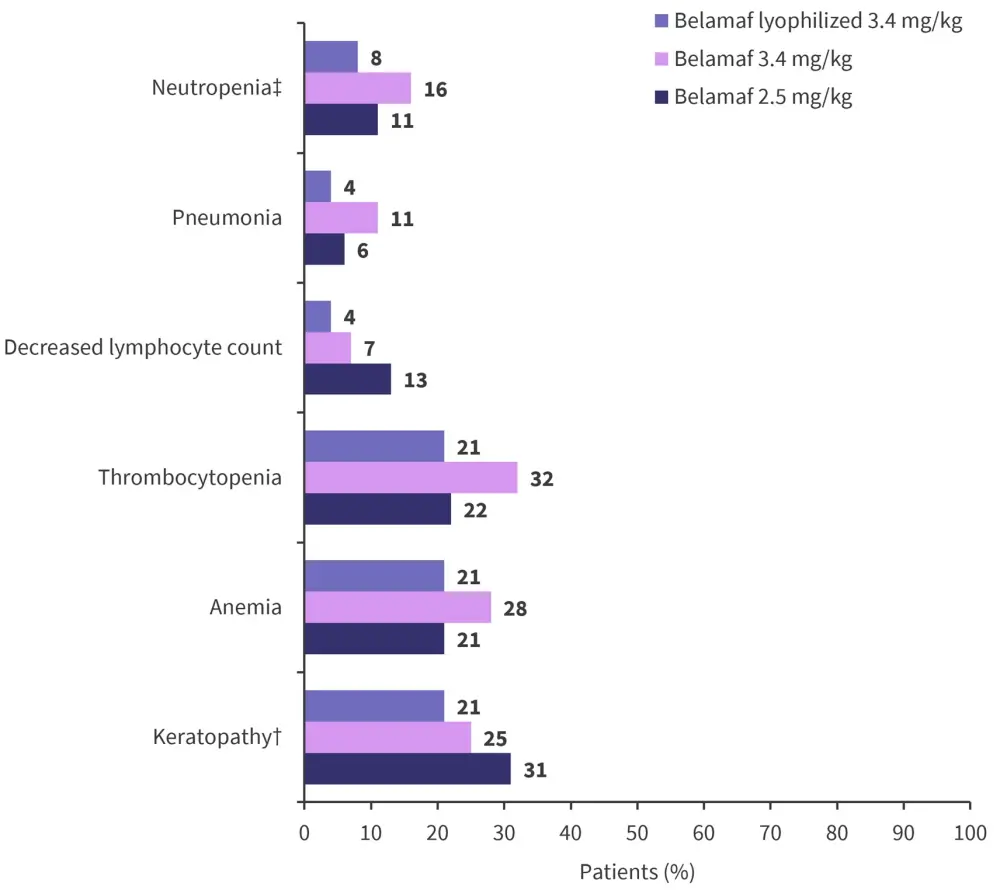 ‡In the 2.5 mg/kg, 3.4 mg/kg, and lyophilized cohorts, 1% (sepsis), 2% (1 cerebral hemorrhage, 1 hemophagocytic lymphohistiocytosis), and 0% of AEs were considered treatment related, respectively.