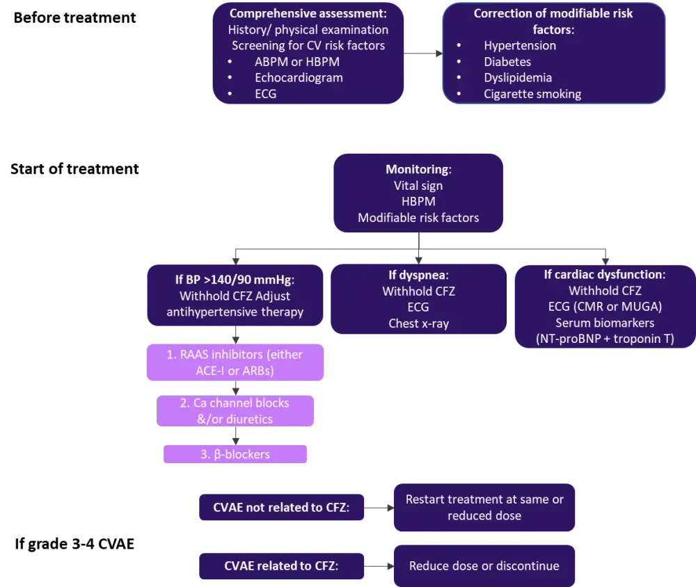 ABPM, ambulatory blood pressure monitoring; ACE-I, angiotensin converting enzyme-inhibitor; ARBs, angiotensin receptor blocker; BP, blood pressure; CFZ, carfilzomib; CVAE, cardiovascular adverse event; ECG, electrocardiogram; HBPM, home blood pressure monitoring; MUGA, multigated angiography; NT-proBNP, N-terminal-pro hormone brain natriuretic peptide; RAAS, renin-angiotensin aldosterone.