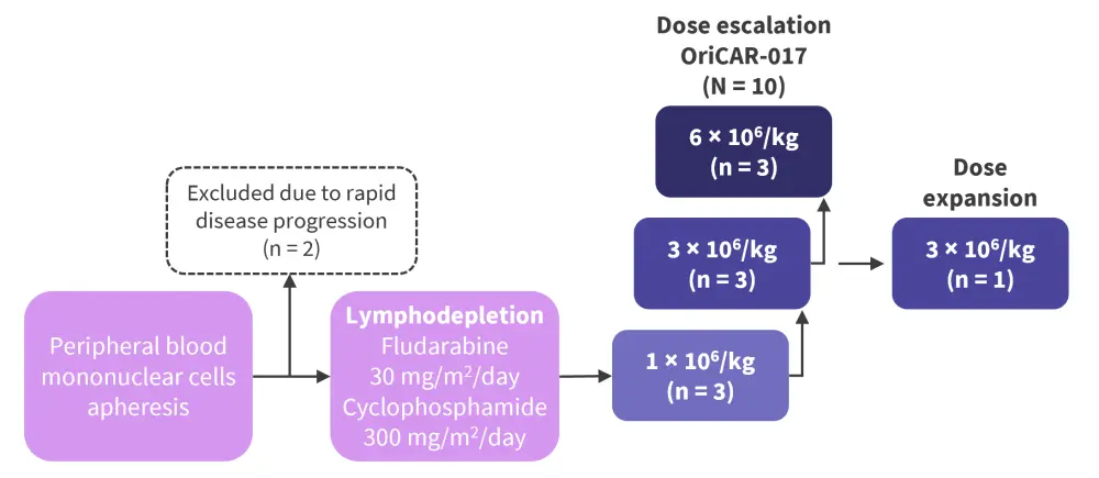 POLARIS is a phase I, open-label, single-center, dose escalation trial in heavily pretreated patients with R/R MM who had a measurable disease as per the International Myeloma Working Group (IMWG) criteria, GPRC5D expression >20% on plasma cells, were previously treated with ≥3 therapeutic options with different mechanisms, and were enrolled between June 2021 and April 2022. Prior BCMA-targeted therapy was allowed. Eligible patients underwent apheresis and lymphodepletion followed by a dose escalation phase with a single infusion of OriCAR-017, as shown in Figure 1.