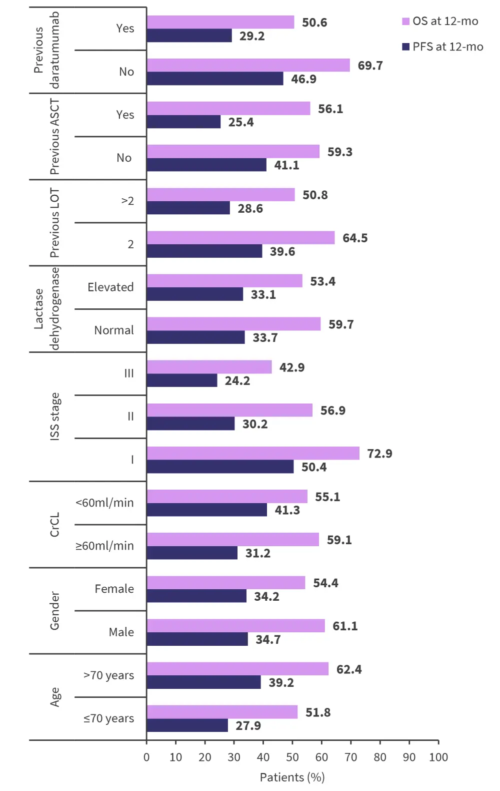 ASCT, autologous stem cell transplant; CrCL, creatinine clearance; ISS, International Staging System; LOT, line of therapy; mo, month; OS, overall survival; PFS, progression-free survival.