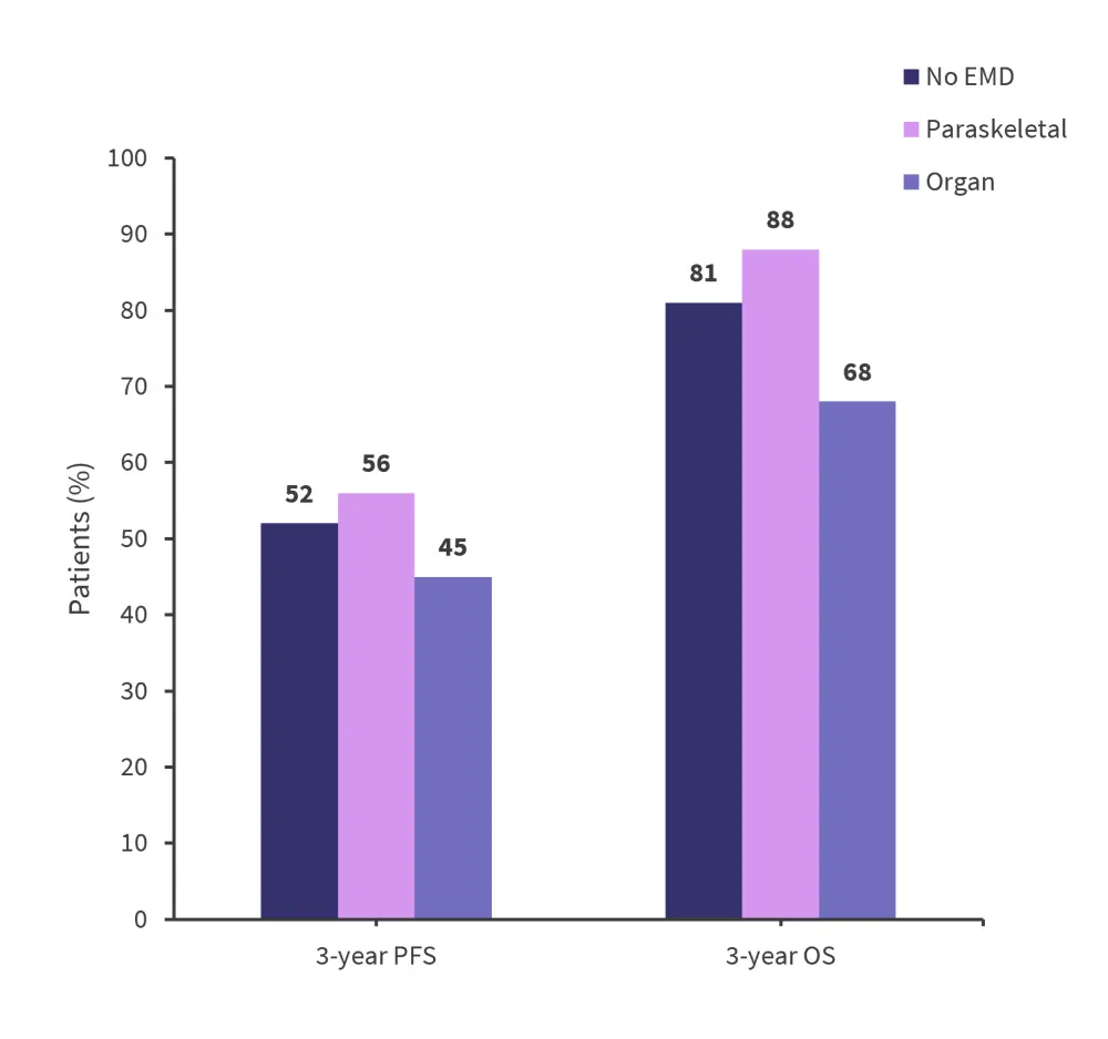 Figure 3. 3-year OS and PFS rates by type of EMM involvement*