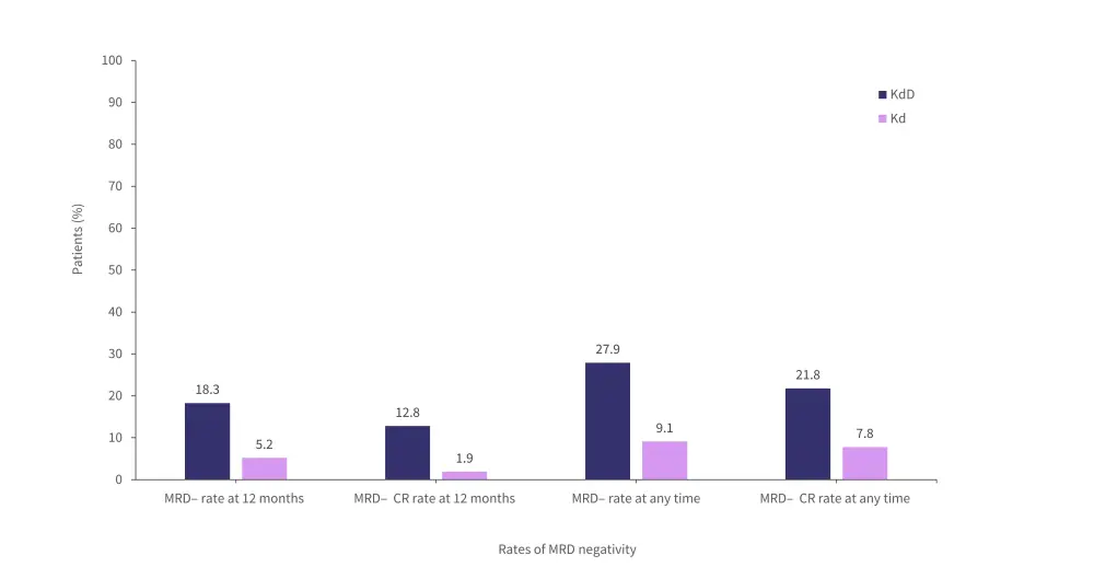 CR, complete response; Kd, carfilzomib + dexamethasone; kdD, carfilzomib + daratumumab + dexamethasone; MRD–, measurable residual disease negative.