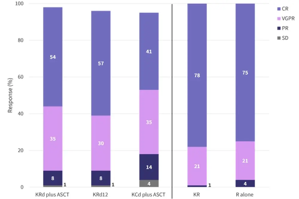 ASCT, autologous stem cell transplantation; CR, complete response including stringent complete response; KCd, carfilzomib + cyclophosphamide + dexamethasone; KR, carfilzomib + lenalidomide; KRd, carfilzomib + lenalidomide + dexamethasone; KRd12, 12 KRd cycles; PR, partial response; R, lenalidomide; SD, stable disease; VGPR, very good partial response.