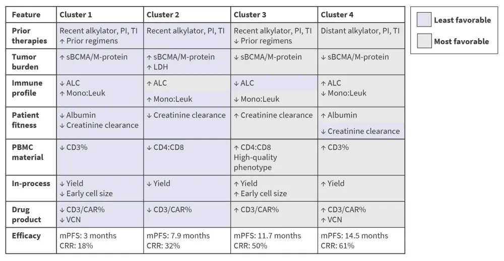 The study used PBMC, process, and product variables to define four patient subgroups or clusters. These clusters showed significantly different clinical outcomes according to PFS and CRR, suggesting a connection between poor manufacturing profiles and less durable clinical efficacy. Cluster 4 demonstrated the best clinical outcomes and cluster 1 presented the least favorable outcomes. Cluster 2 contained the most patients and was associated with intermediate manufacturing endpoints (Figure 3).