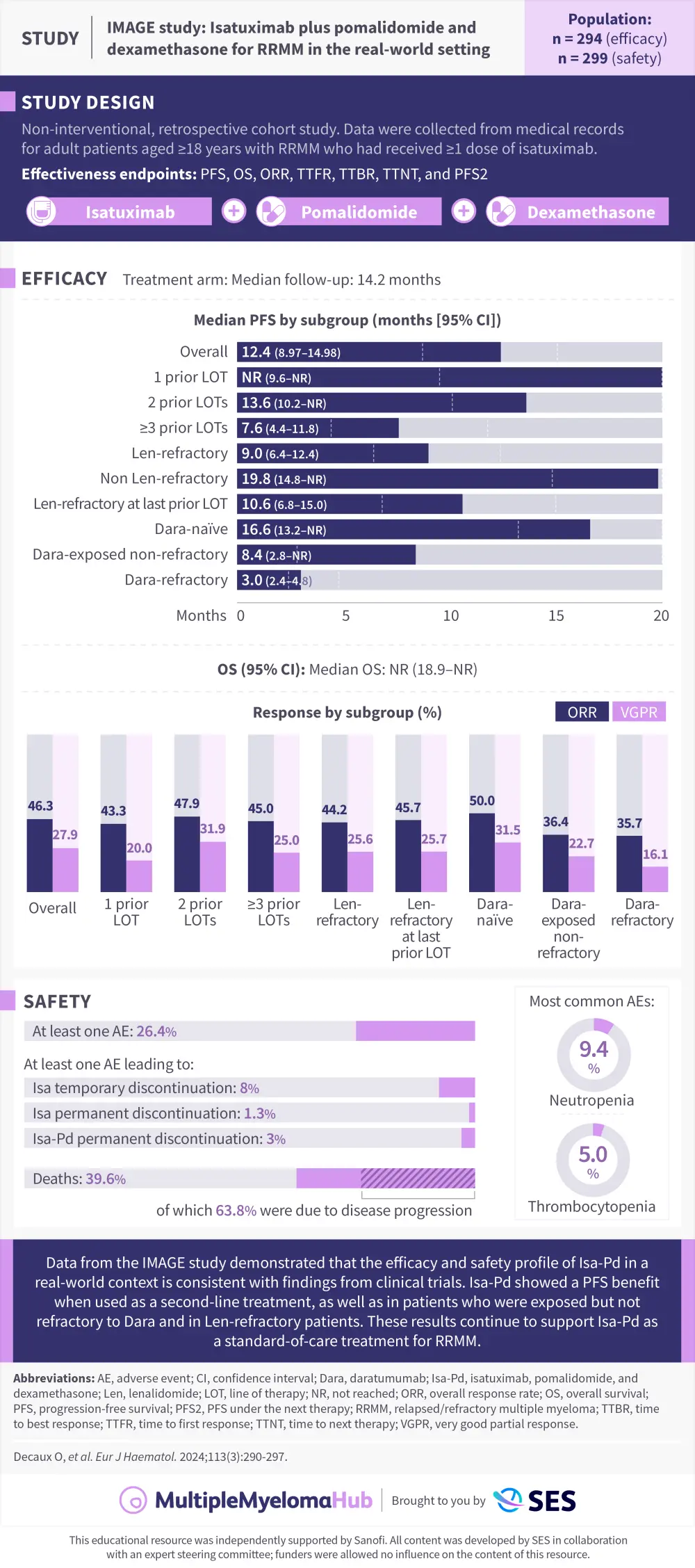 The Multiple Myeloma Hub is pleased to present a visual abstract of a retrospective study by Decaux et al.1 which evaluated real-world outcomes following at least one dose of isatuximab in combination with pomalidomide and dexamethasone (Isa-Pd) for the treatment of relapsed/refractory multiple myeloma (RRMM). The data from these patients were separated by subgroups based on prior lines of therapy as well as refractoriness to lenalidomide and daratumumab.1