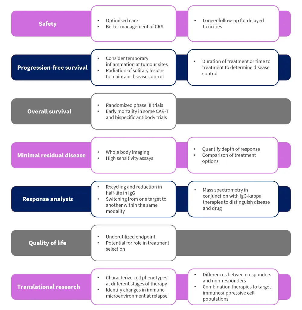 Recent immune therapy approvals including novel approaches, such as CAR T-cell therapy, bispecific antibodies, and antibody–drug conjugates, represent a significant advancement in the treatment landscape for multiple myeloma (MM).1 While response rates for these new therapies are often favorable, these therapeutic approaches highlight new safety and efficacy considerations, which in turn provide opportunities for innovative implementation into standard clinical trial designs.1
