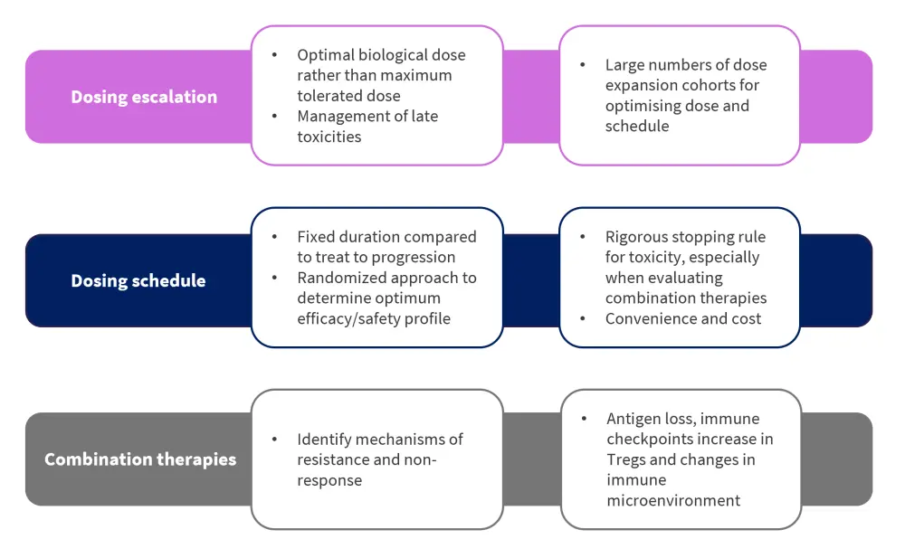 Determining the optimal dosing schedule remains a challenge for immune therapies. In particular, IgG- based therapies possess an expected half-life of 2–3 weeks, thus may require continuous dosing. Furthermore, bispecific antibodies have a time to first response of around 1 month and so present an opportunity for future trials to evaluate different maintenance schedules after initial induction.