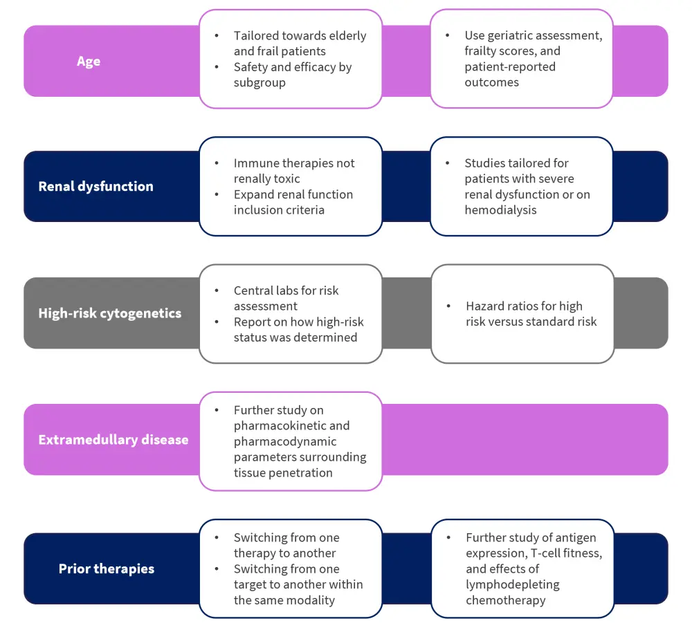 Advances in the treatment landscape of MM result in many elderly patients surviving for several years after diagnosis. Thus, current trial designs require adaptation to fully include this patient subgroup. Based on frailty scores considerations, this patient population has commonly been excluded from MM trials, due to inferior overall survival and general increased risk of adverse events compared with other patient groups. Although comprehensive safety profiles of specific toxicities require further understanding, immune therapy now offers extremely low rates of organ toxicity, which could prove advantageous for patients of older age and with comorbidities. With regards to efficacy evaluation, it is also important to consider that a decline in T-cell function is often observed with older age and anti-MM therapy. Particularly, progression of MM results in overall reduced effector T-cell and NK-cell function, as well as decline of memory T-cell levels, all of which impact CAR T-cell therapy and bispecific antibody therapy. Based on these safety and efficacy observations, randomized trial designs should stratify patients based on age and Eastern Cooperative Oncology Group performance scores, while offering subgroup analyses data. Additionally, pilot studies tailored to patients of older age should include geriatric assessments, frailty scores, and patient-reported outcomes to help optimize patient selection. Check out our previous article on effective care in the elderly population published on the Multiple Myeloma Hub.