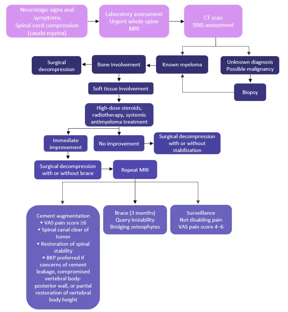 BKP, balloon kyphoplasty; CT, computed tomography; MRI, magnetic resonance imaging; SINS, spinal instability neoplastic score; VAS, visual analogue scale.