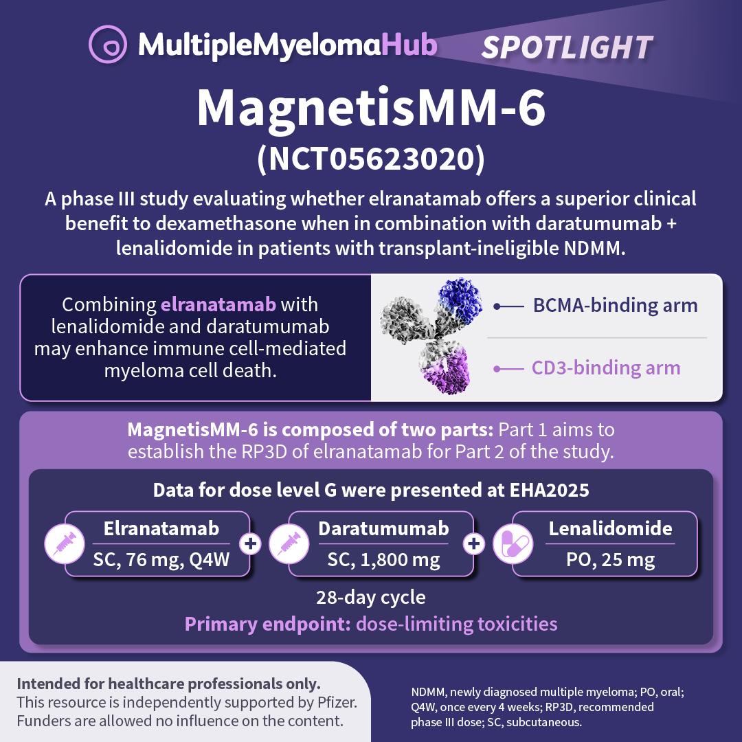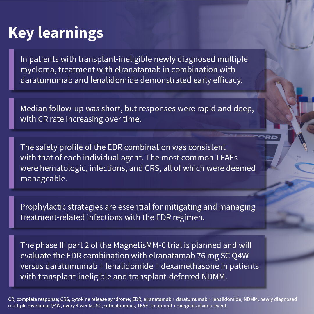 During the European Hematology Association (EHA) 2025 Congress, June 12–15, 2025, Milan, IT, Meletios A. Dimopoulos shared the initial results from the phase II MagnetisMM-6 study (NCT05623020) part 1, dose level G of elranatamab in combination with daratumumab and lenalidomide (EDR) for the treatment of transplant-ineligible newly diagnosed multiple myeloma.