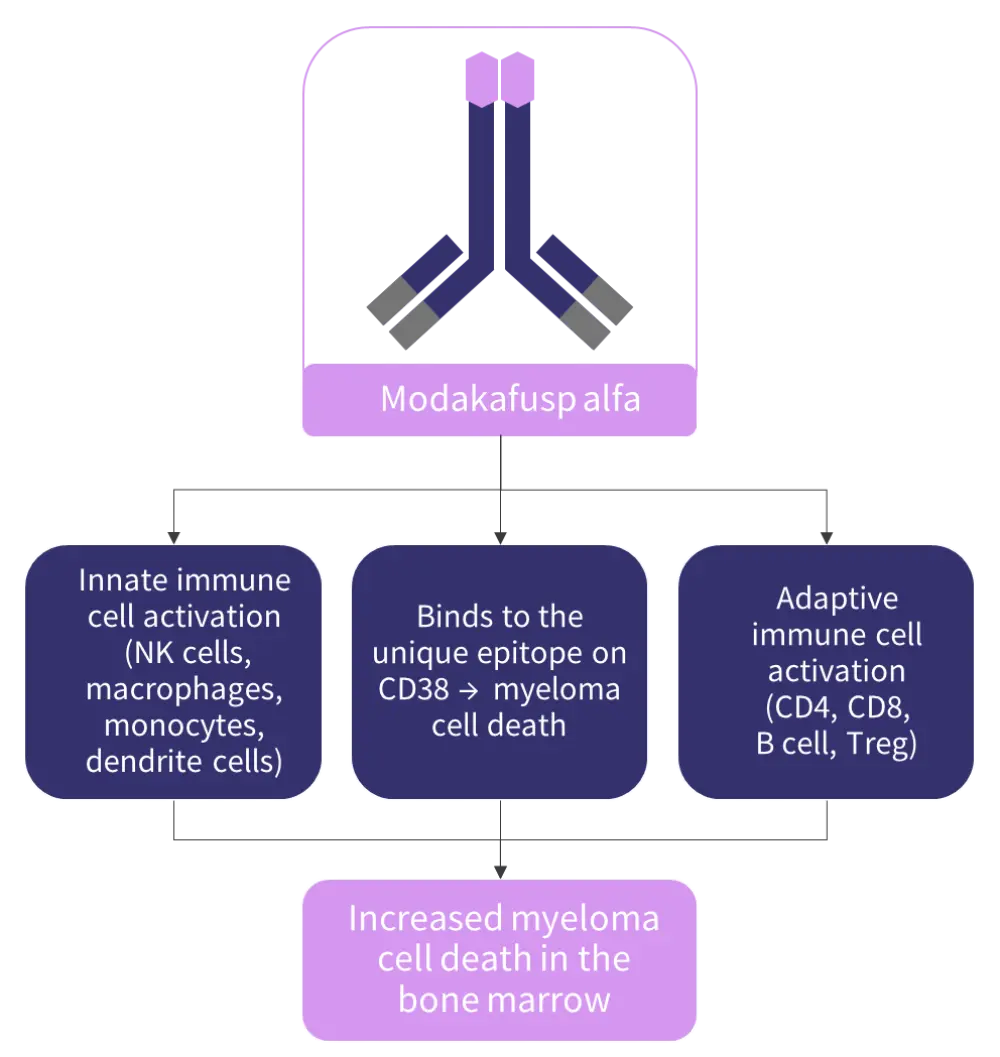 Modakafusp alfa, previously known as TAK-573, selectively binds to a unique epitope on CD38, different to the binding epitope of the anti-CD38 mAbs approved for the treatment of multiple myeloma (MM), i.e., daratumumab and isatuximab.1,2 Through the INF-α receptor, modakafusp alfa directs anti-proliferative/apoptotic signals to tumor cells, inducing tumor cell death.2 Besides the anti-myeloma activity, modakafusp alfa also activates innate and adaptive immune cells.2 It is hypothesized that the activated immune cells and dead myeloma cells can produce a synergistic effect in destroying more malignant plasma cells in the bone marrow (Figure 1).2 Furthermore, the specificity of targeting interferon directly to the myeloma cells reduces the potential risk for off-target binding and toxicity in patients with relapsed/refractory multiple myeloma (RRMM).1