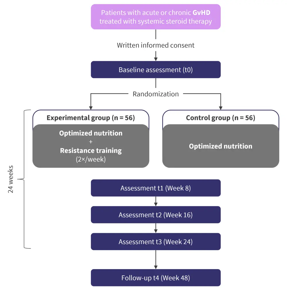 IRENE-G is a 24-week, interventional, randomized, controlled trial exploring the role of nutritional support and exercise in patients with GvHD who have undergone HSCT. The full study design can be seen in Figure 1. The study is expected to run for ~2 years and is aiming to recruit 56 participants to each of two arms (112 total):