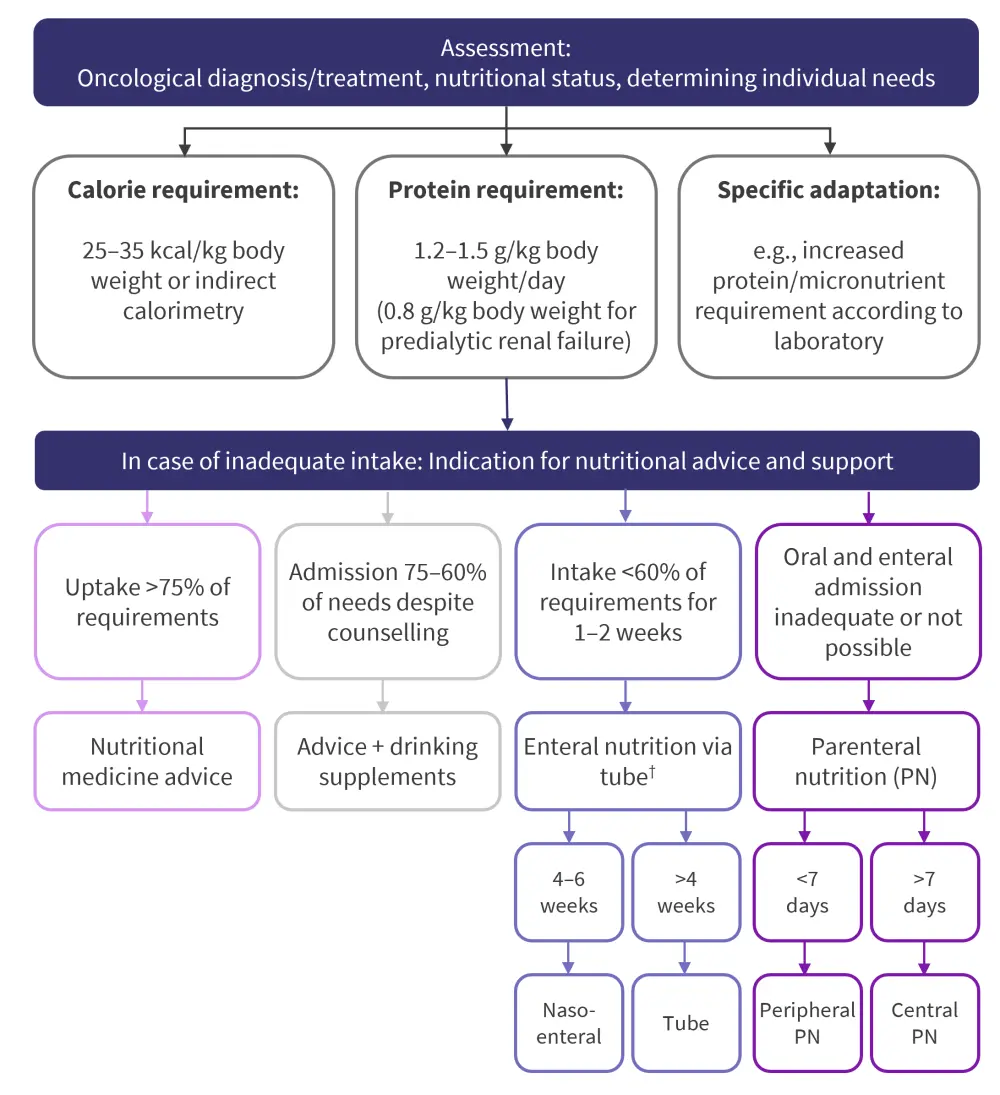†In the absence of patient adherence or contraindication to tube feeding, immediate parenteral nutrition is indicated