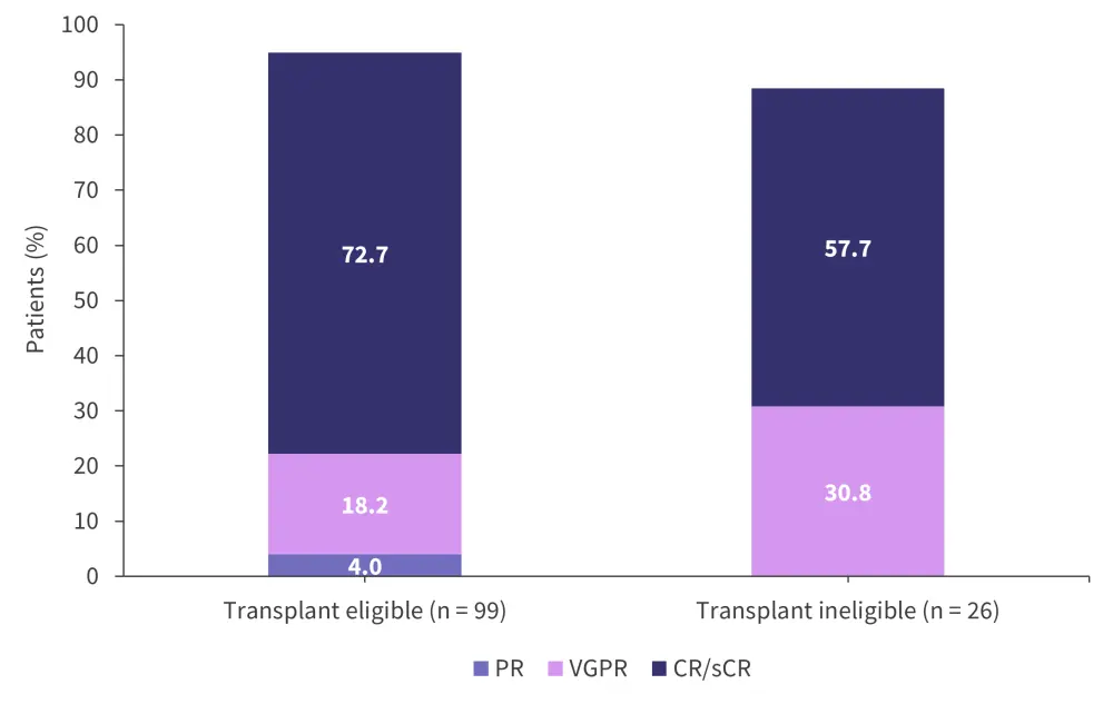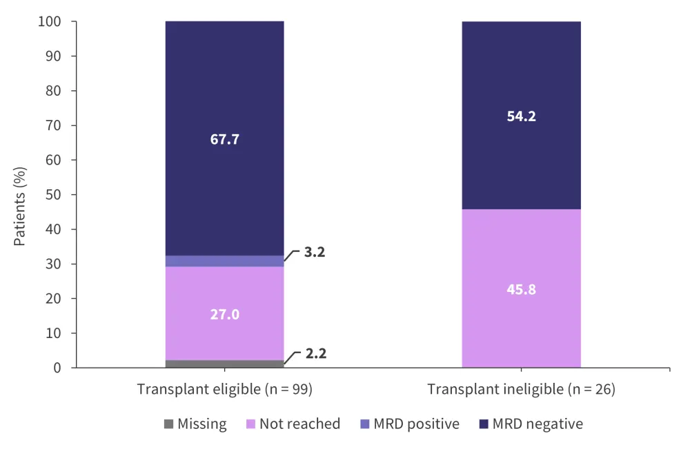 The overall response rate for the patients eligible for transplant was 94.9% compared with 88.5% for patients who were ineligible for transplant. The MRD rates (assessed at a 10−5 sensitivity) for patients eligible for transplant and patients transplant ineligible are shown in Figure 5. The best responses through consolidation treatment are highlighted in Figure 6.