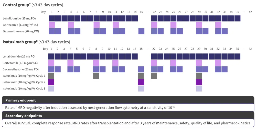 ‡Three cycles of induction therapy with isatuximab plus lenalidomide, bortezomib, and dexamethasone.