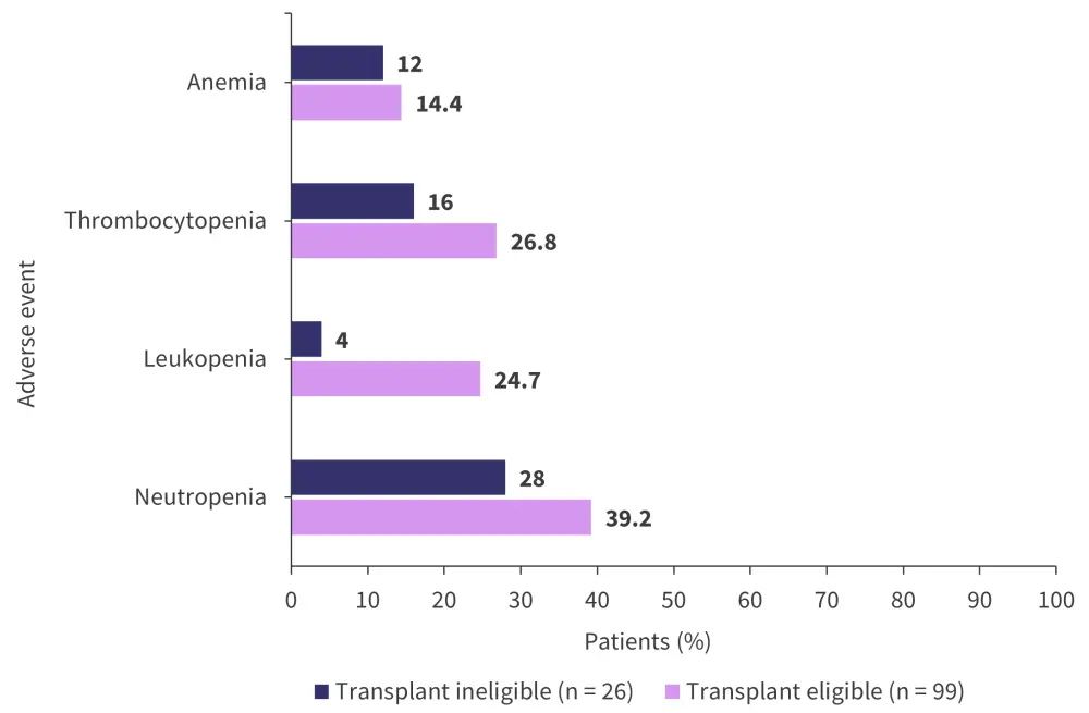 A total of 78.4% of patients eligible for transplant experienced ≥3 AEs of any grade compared with 72% of patients ineligible for transplant. The most common AEs of any grade for both treatment arms are shown in Figure 7.