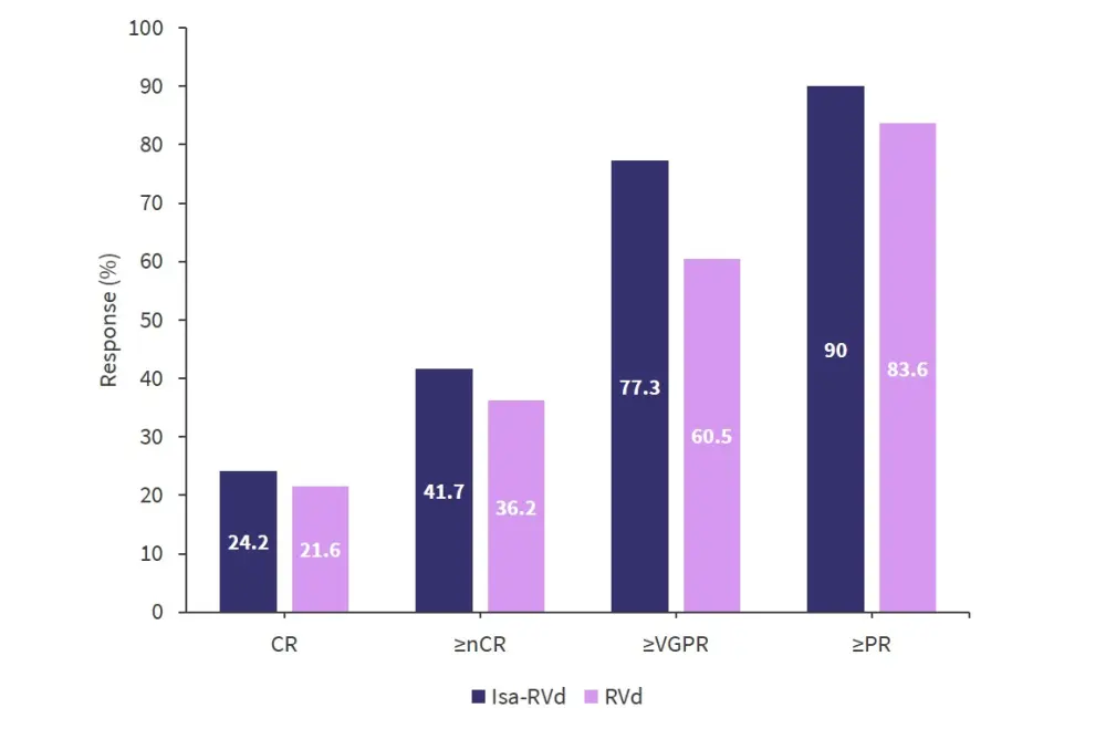 CR, complete response; Isa, isatuximab; nCR, near complete response; PR, partial response; RVd, lenalidomide, bortezomib, and dexamethasone; VGPR, very good partial response.