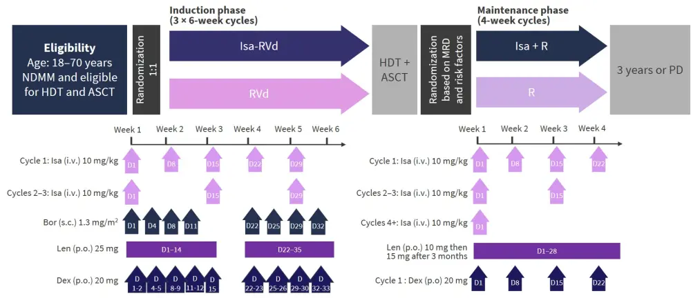 ASCT, autologous stem cell transplantation; Bor, bortezomib; D, day(s); Dex, dexamethasone; HDT, high dose therapy; i.v., intravenous; Isa, isatuximab; Len, lenalidomide; MRD, measurable residual disease; NDMM, newly diagnosed multiple myeloma; p.o., orally; PD, progressive disease; RVd, lenalidomide, bortezomib, and dexamethasone; s.c. subcutaneous.