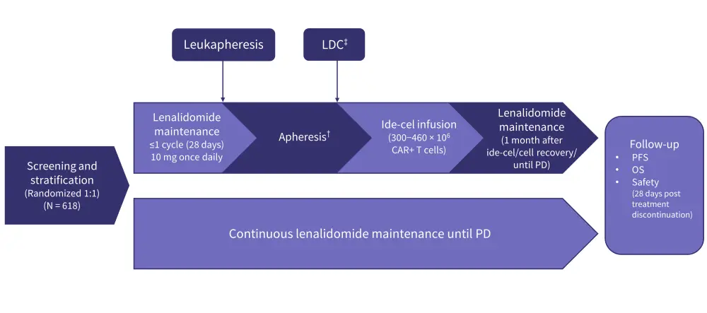 CAR, chimeric antigen receptor; ide-cel, idecabtagene vicleucel; LDC, lymphodepleting chemotherapy; OS, overall survival; PD, progressive disease; PFS, progression-free survival.