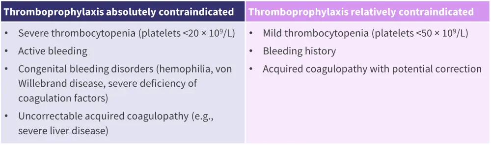All patients with MM eligible for anti-myeloma treatment should be considered for thromboprophylaxis. Thromboprophylaxis type, intensity, and duration should be tailored according to individual baseline thrombotic and hemorrhagic risk profiles. Contraindications for thromboprophylaxis are shown in Figure 2.