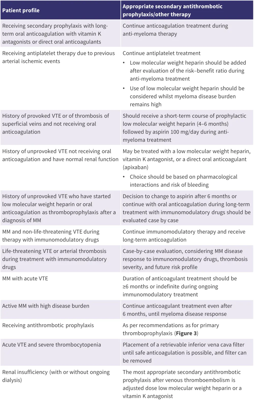 In general, acute thrombosis treatment during active MM treatment should not differ from standard recommendations. Considerations for determining appropriate secondary antithrombotic prophylaxis in selected patient subpopulations are outlined in Figure 4.