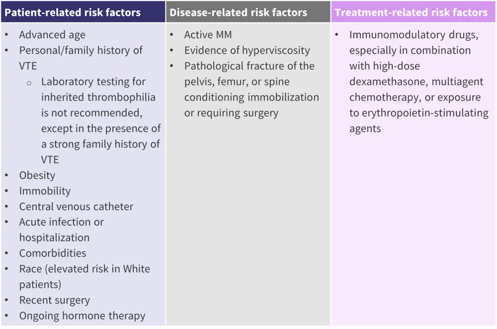 All patients with MM who are candidates for treatment require a thrombosis risk evaluation to prevent thromboembolic complications. Evaluations should include patient, disease, and treatment-related risk factors (Figure 1).