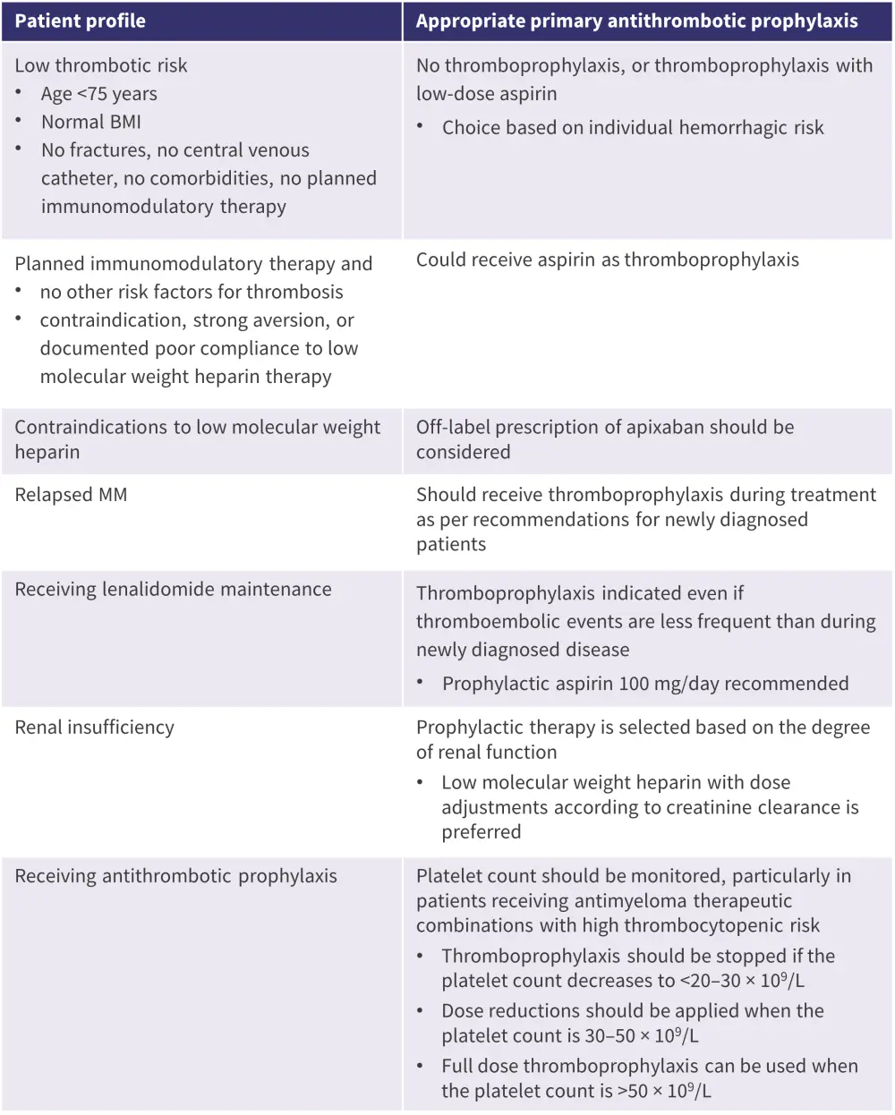 De Stefano et al. provide general recommendations for thrombosis management in MM, as well as recommendations for key patient subpopulations. The expert panel advise that all patients with MM requiring treatment should receive a thrombosis risk evaluation to prevent thromboembolic complications. The evaluation should include patient, disease, and treatment-related risk factors, and concomitant bleeding risk assessment. Recommendations for primary antithrombotic prophylaxis, early treatment of acute thrombotic events, secondary antithrombotic prophylaxis, and re-exposure to anti-myeloma drugs are based on patient profile. These recommendations aim to minimize the risk of thrombosis and maximize treatment adherence in patients with MM who require active treatment.