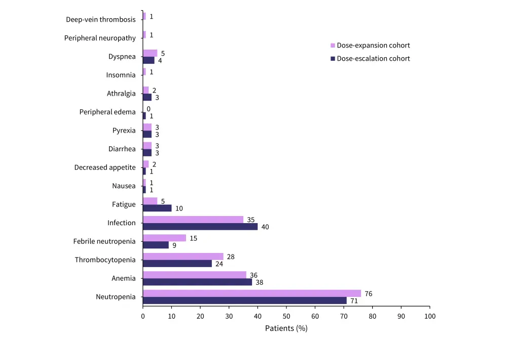 The most common adverse events in both the dose-escalation and dose-expansion cohorts were hematologic. Neutropenia was the most common, occurring in 81% and 77% of patients in dose-escalation and dose-expansion cohorts, respectively. All Grade ≥3 adverse events in both cohorts are shown in Figure 3.