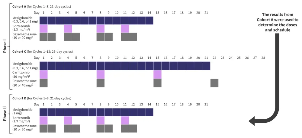 Phase I of the trial involved dose escalation, with patients receiving a 1 mg dose of mezigdomide in combination with two other drugs. Phase II of the trial involved dose expansion, using the results from phase I to determine the dosing regimen. In total, there were ten cohorts in this trial, evaluating mezigdomide with bortezomib, carfilzomib, daratumumab, elotuzumab, and isatuximab. The phase I results from Cohort A (mezigdomide with bortezomib and dexamethasone; Mezi-Vd) and Cohort C (mezigdomide with carfilzomib and dexamethasone; Mezi-Kd) and phase II results from Cohort D (Mezi-Vd) are shown in this article.
