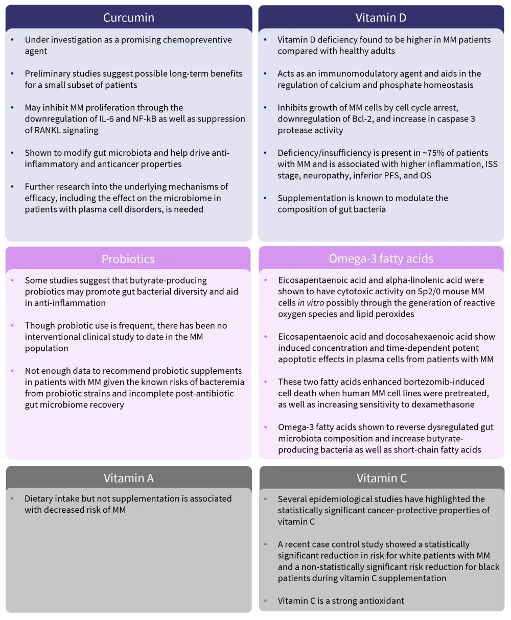 The risk of MM has been shown to be lower in individuals who eat a plant-based diet when compared with meat eaters. The consumption of fruit, cruciferous vegetables, fish, and whole grains have all been shown to reduce the risk of MM. Patients diagnosed with MM consistently present with a vitamin D deficiency, which negatively impacts myeloma activity, bone turnover, and survival outcomes. Dysregulation of the microbiome is regularly observed in patients with MM, and several studies are currently investigating the effects of diet and supplementation, with a particular emphasis on increasing butyrate-producing bacteria.