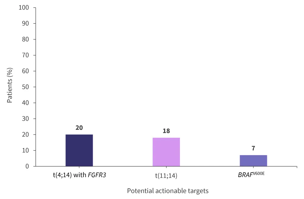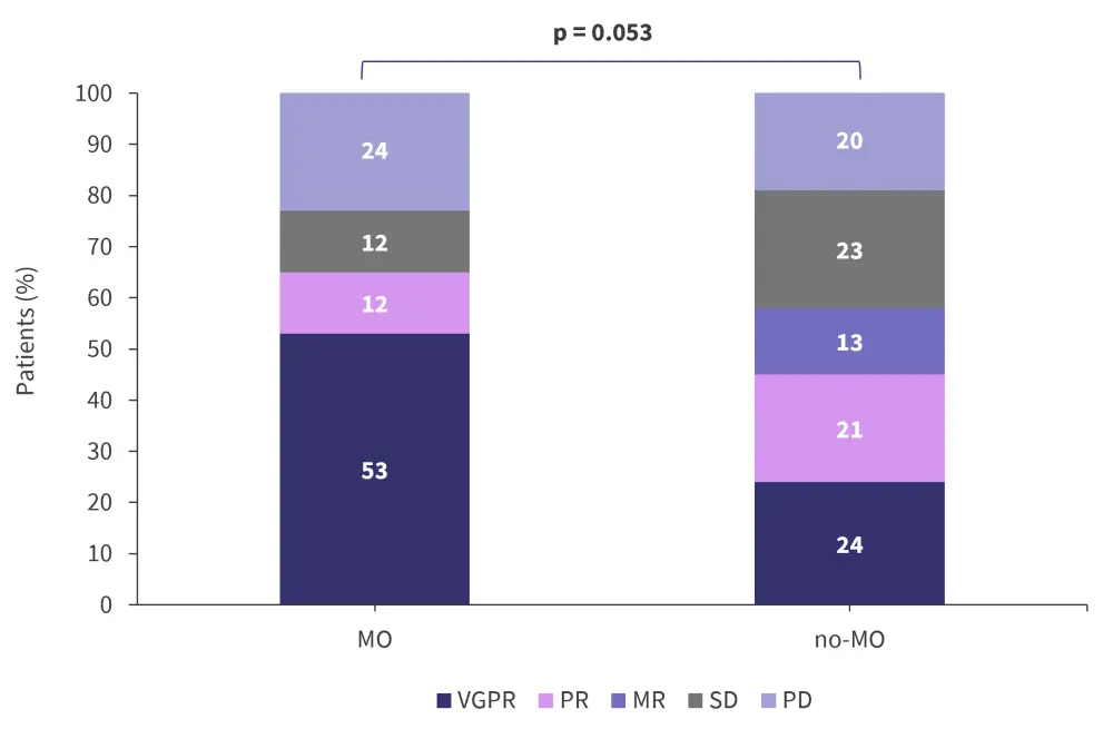 Potentially actionable molecular targets were identified in 48% of patients (Figure 3). The median variation in measurable monoclonal component in serum was a reduction of 91% vs 30% (p = 0.33) in the MO and no-MO groups.