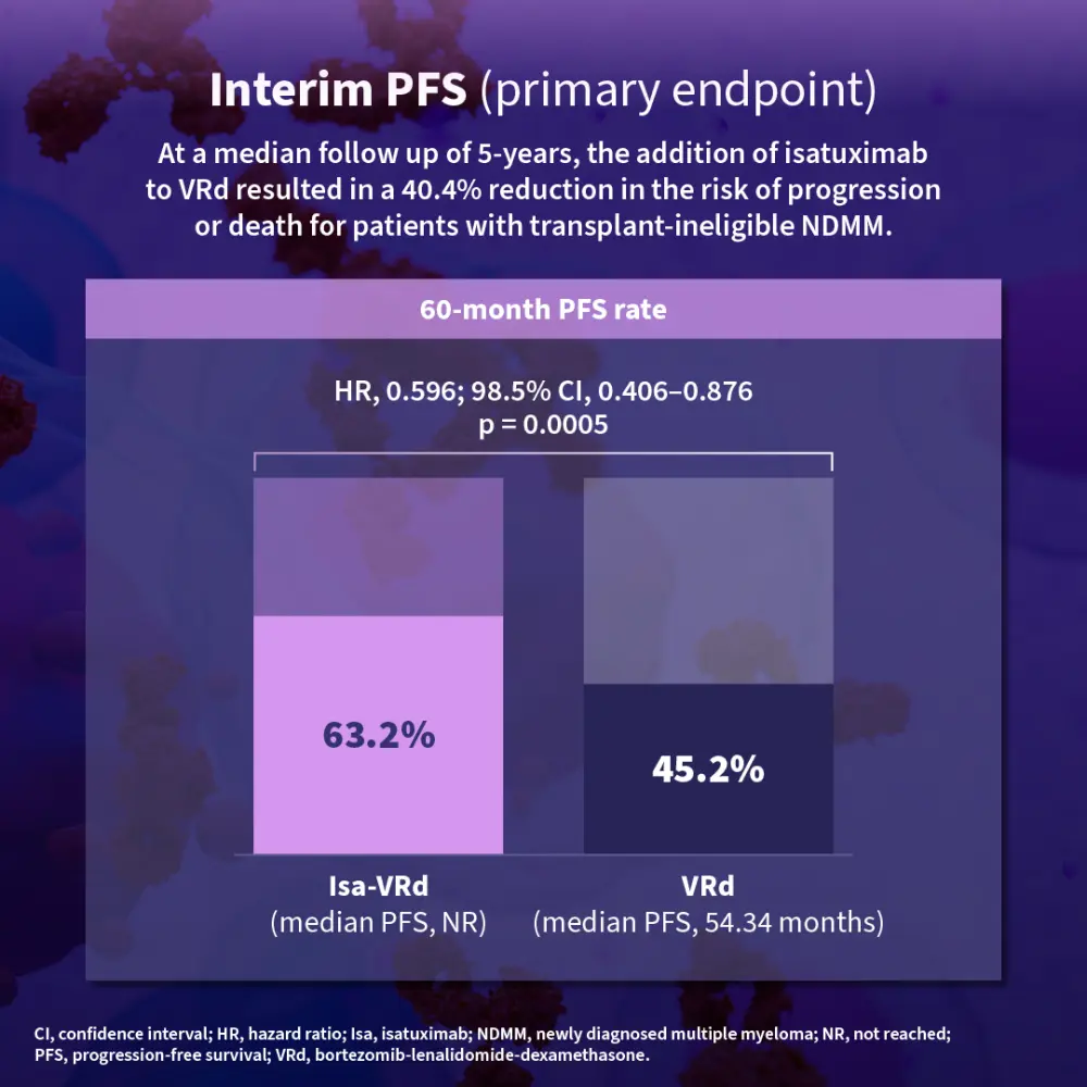 The primary endpoint of progression-free survival was met, demonstrating a 40.4% reduction in the risk of progression or death with Isatuximab in combination with bortezomib, lenalidomide, and dexamethasone in patients with transplant-ineligible newly diagnosed multiple myeloma.