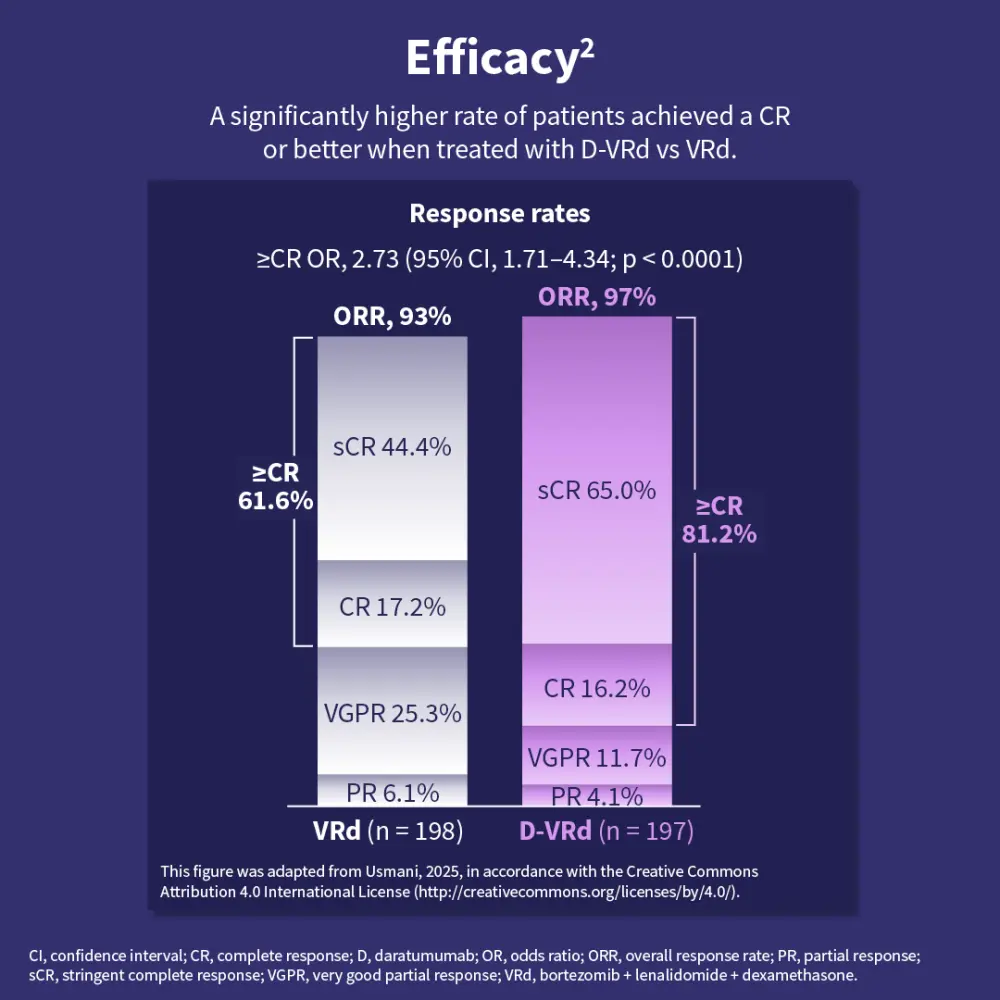 The primary endpoint was measurable residual disease (MRD) negativity at a sensitivity of ×10-5, which was significantly higher with D-VRd vs VRd. The quadruplet regimen also improved outcomes vs VRd across key secondary endpoints including sustained MRD negativity, complete response, and progression-free survival.